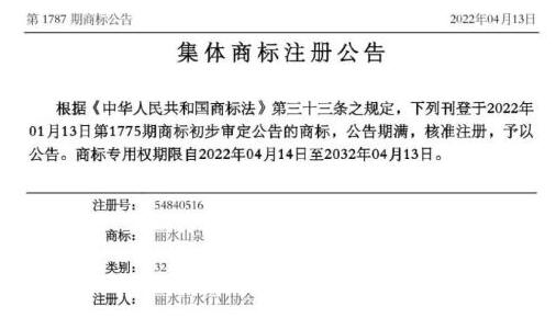 國家商標局發布《集體商標注冊公告》,“麗水山泉”集體商標結束3個月的初審公告期,正式核準注冊,這是麗水“山字系”品牌建設之路上的又一個里程碑!