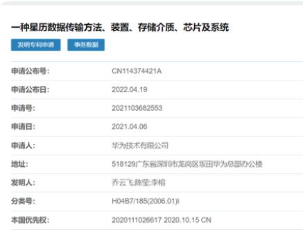 4 月 19 日,華為技術有限公司公開專利“一種星歷數據傳輸方法、裝置、存儲介質、芯片及系統”,公開號為 CN114374421A。