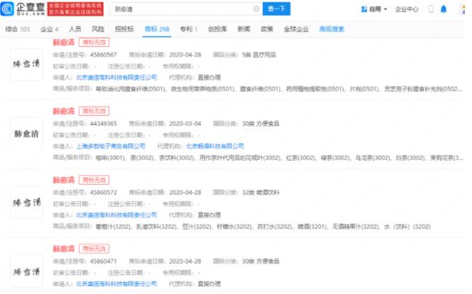 近日,繼“楊迪(陽敵)”諧音梗之后,“費玉清(肺愈清)”諧音梗也走紅網(wǎng)絡(luò)。企查查APP顯示,“肺愈清”商標申請信息已有10條,申請人包括位于上海、北京、廣州、深圳等地的多家公司,國際分類包括醫(yī)藥、啤酒飲料、方便食品。不過,大部分商標流程狀態(tài)為“商標無效”;廣州某公司申請的兩枚商標處于“注冊申請中”、“駁回待復(fù)審”。